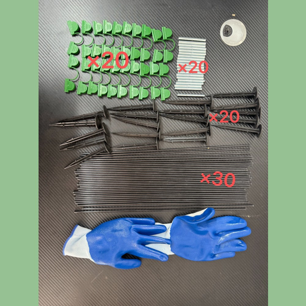 Material: Fiberglass rods; Iron tubes; PP film clips; PP ground stakes