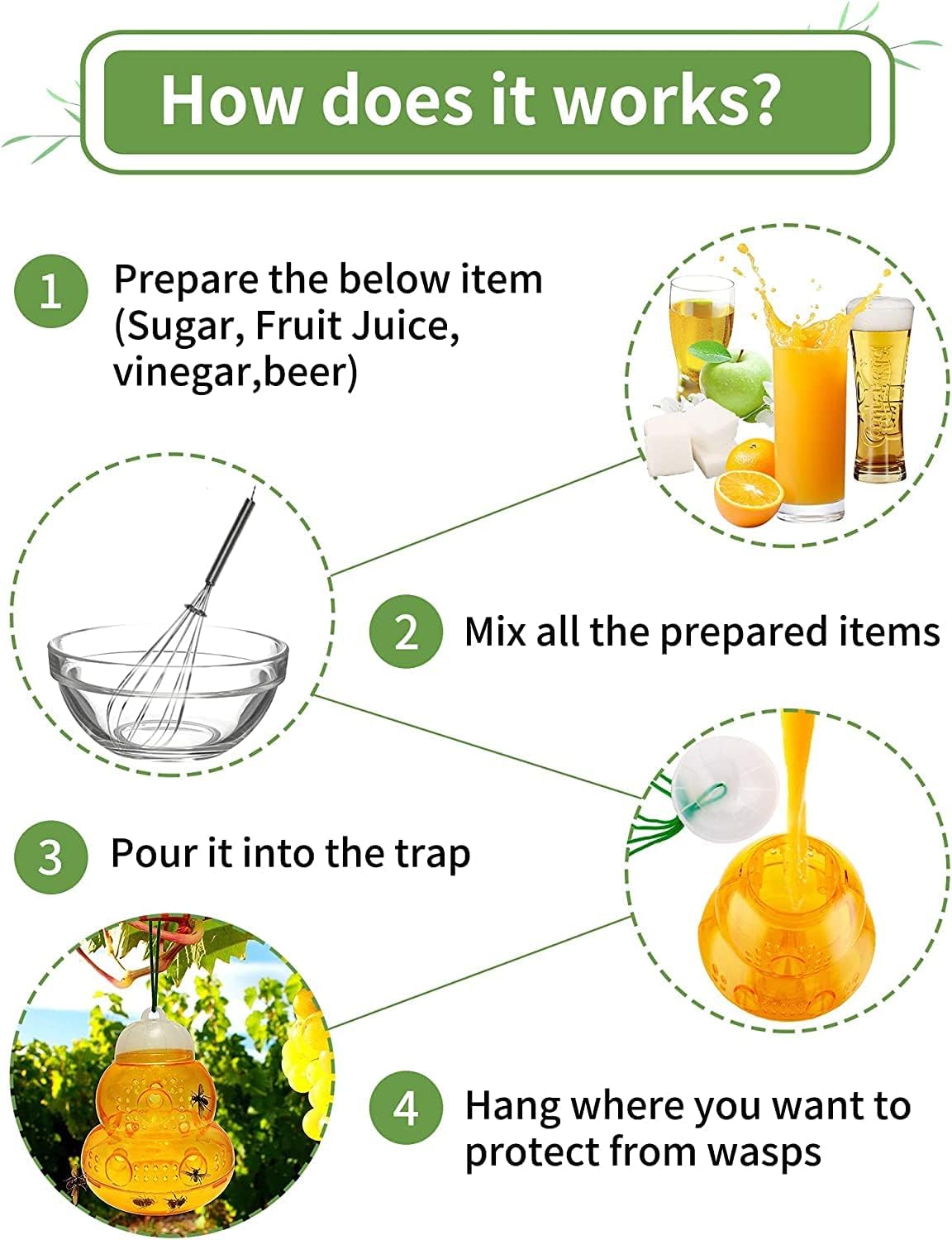 - User-Friendly and Sustainable: These wasp traps are straightforward to use; simply add a natural bait and place the trap in an insect-prone area. The robust construction allows for multiple uses—just clean and replenish the bait as needed.