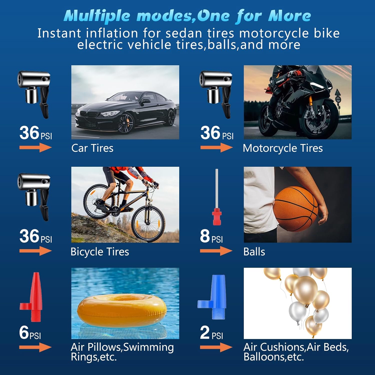 Versatile Inflation Modes: With support for multiple inflation modes—including car, bike, motorcycle, and sports ball modes—this pump allows you to set and lock a desired pressure value. The device automatically stops when the preset pressure is reached, preventing overinflation and ensuring safe operation. It inflates up to 150 PSI, making it suitable for a wide range of needs.