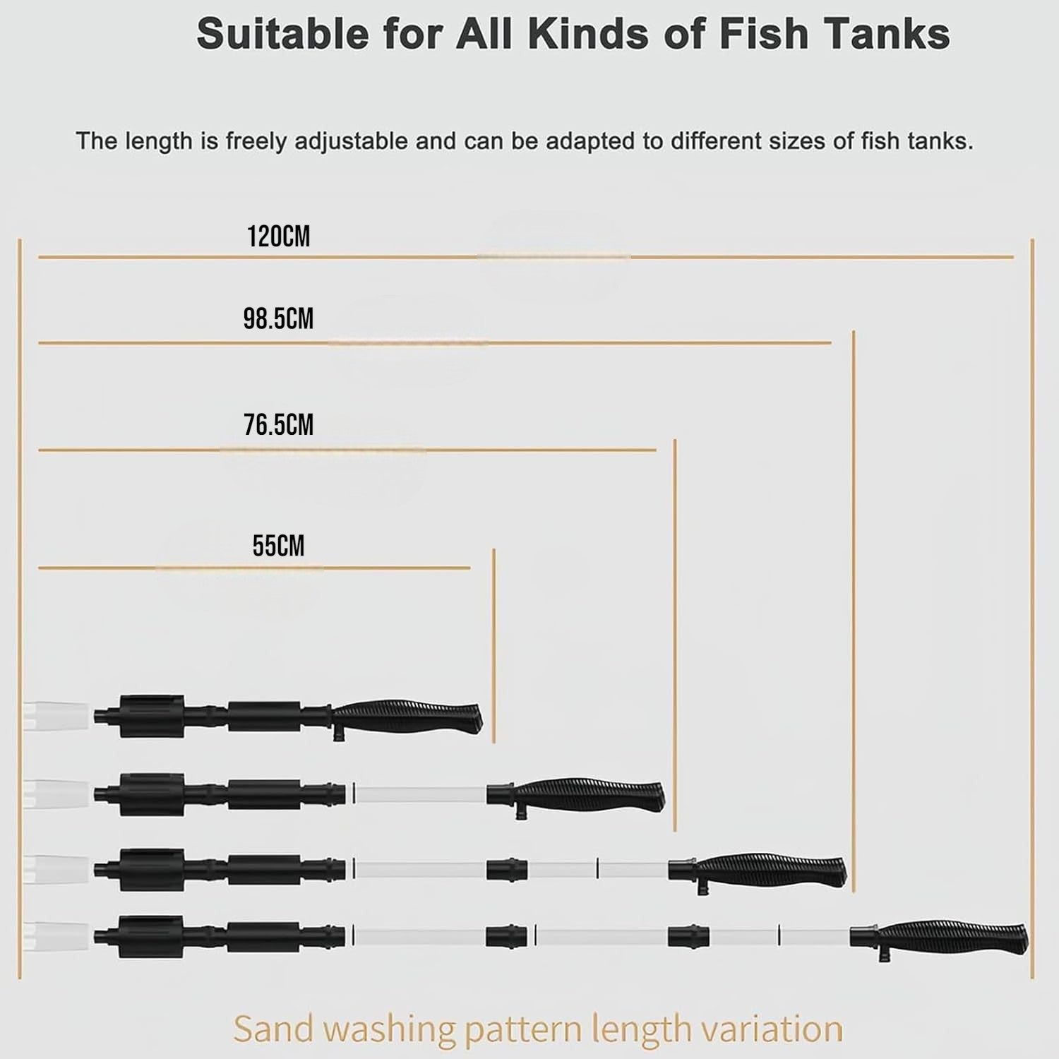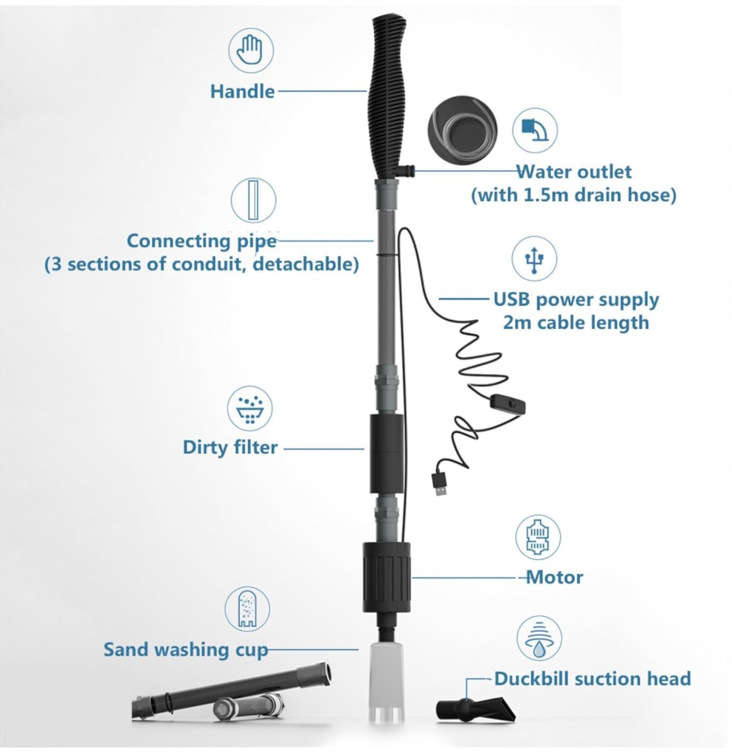 Brief Summary Description: This electric sand washer is an indispensable tool for every aquarium owner. Powered by a high-performance brushless motor and USB supply, it combines sand washing, water changing, and waste removal into one easy-to-use device. Its adjustable length and effective filtration bin make tank maintenance simple, fast, and thorough.