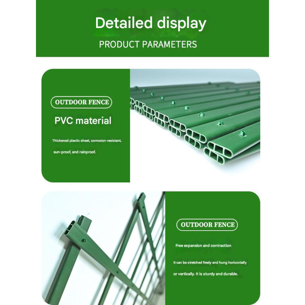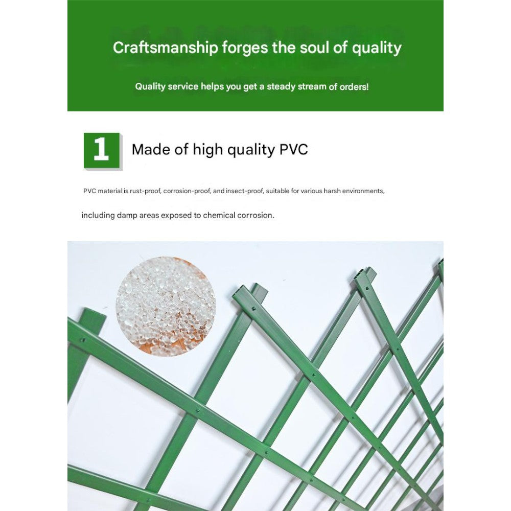 Brief Summary Description: This green expandable PVC fence is a durable and versatile solution for garden and home decoration. Its weather-resistant material ensures longevity, while the adjustable lattice design provides perfect support for climbing plants or privacy screening. Ideal for both indoor and outdoor use.