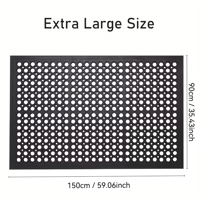 Upgrade your workspace safety with this 90x150cm heavy-duty rubber drainage mat. Its 10mm thick, anti-fatigue construction provides all-day comfort, while the high-traction surface and rapid drainage design ensure a stable and slip-free floor.